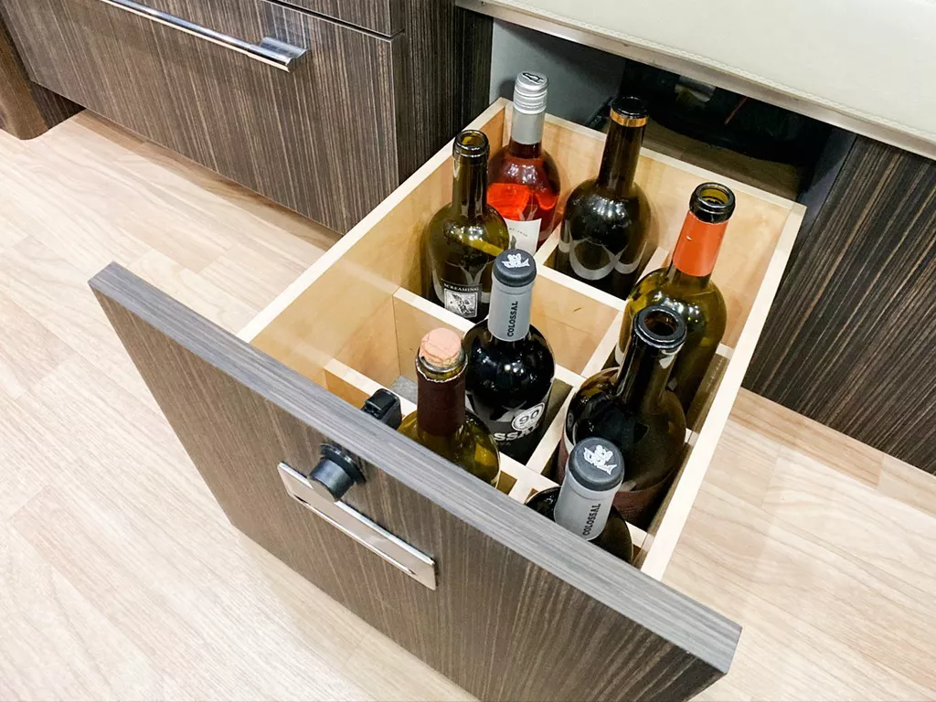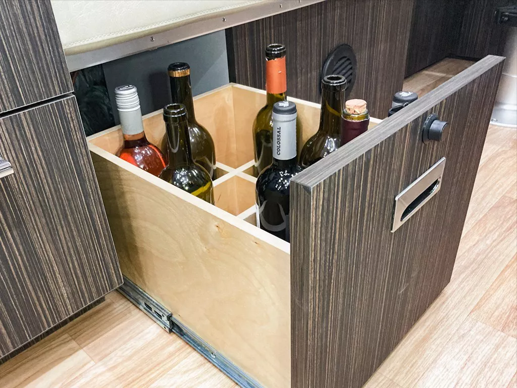 Neatly store your bottles and always have your favorite beverage ready for unexpected guests with beverage drawer solutions from Ultimate Airstreams. Drawers can be added under the lounge, under your dinette, in overhead hatches, and almost anywhere else it's most convenient for you.
